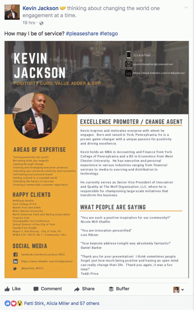 That took a lot of guts and I am proud of him for taking the leap. (P.S. If you want a positive speaker on “Turning Positivity into Profits” contact Kevin at http://thepositivityguru.com.)