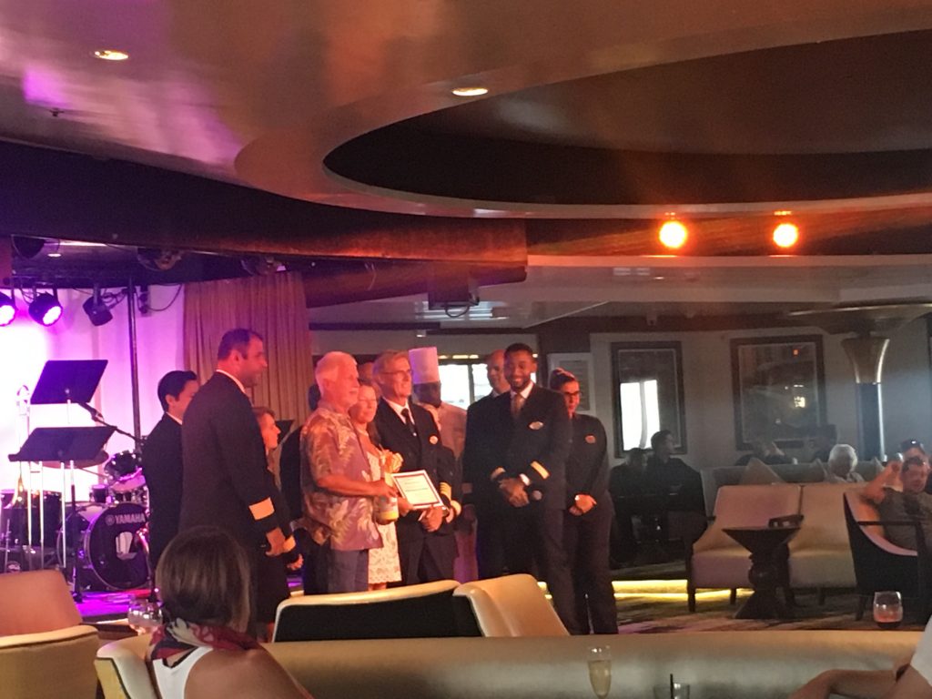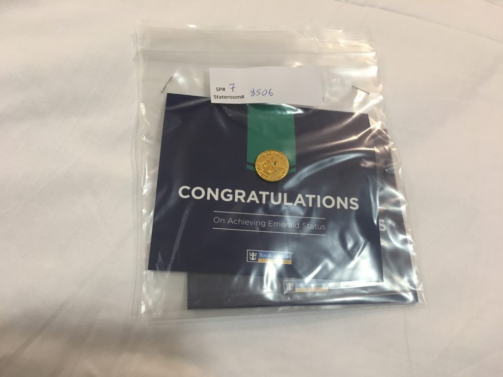 Then, as you continue to spend money, they continue to reward you with awards and congratulations. We returned from dinner one night while aboard to find two pins on our bed congratulating us for achieving “Emerald” status.
