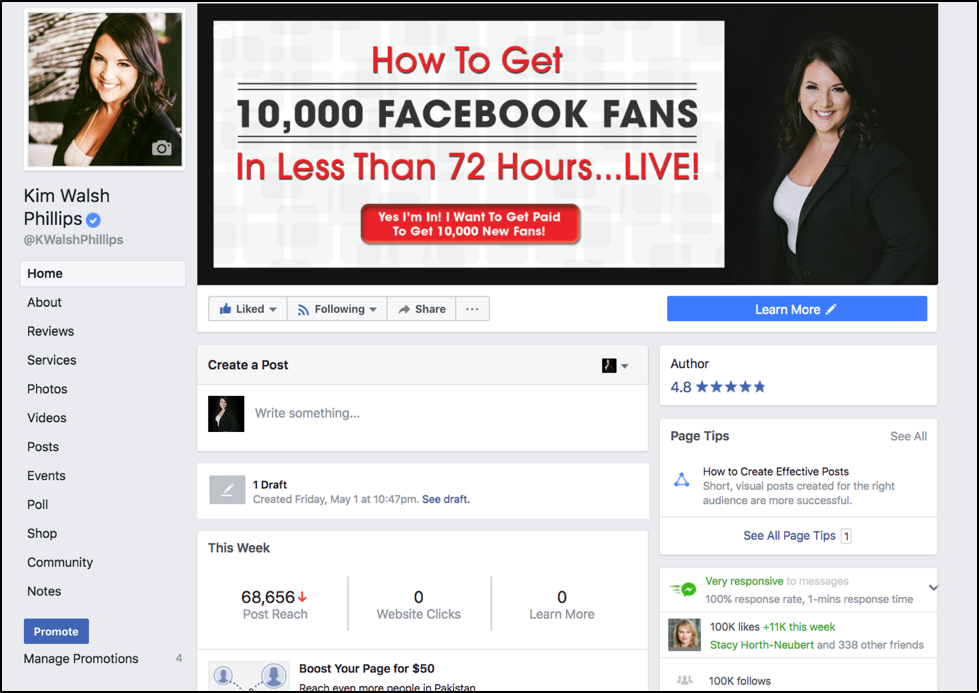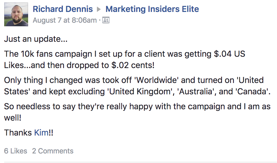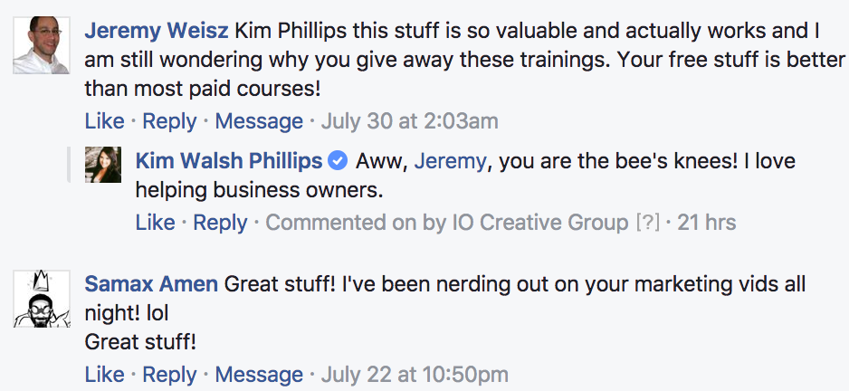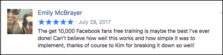 Kim, Great content as always. I attended your training on How to Get 10,000 Fans in 72 Hours and it flat out WORKED!! I was able to get fans for less than a penny each. And these are people who are engaging with my page and sharing content.