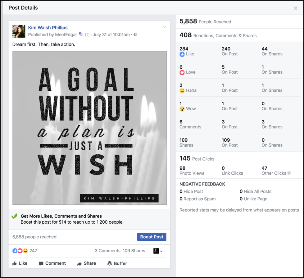 But that just isn’t true. Here’s a recent post that included no ad spend at all. It reached thousands of people for free. You tell me another media channel that will let you reach thousands each day for free!