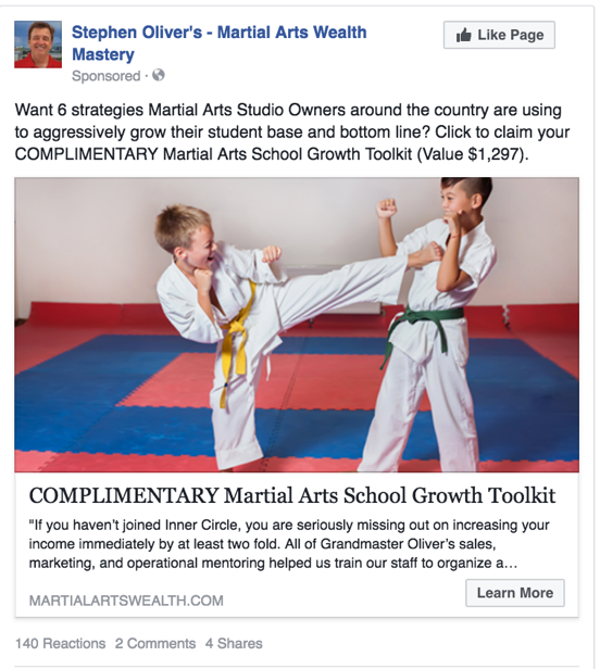 For example, for one of our private clients Stephen Oliver, we target Martial Art Studio Owners with a lead magnet that shares strategies from studios around the country. The lead magnet isn’t all about Stephen or his program. Instead, it is about the successes of his members.